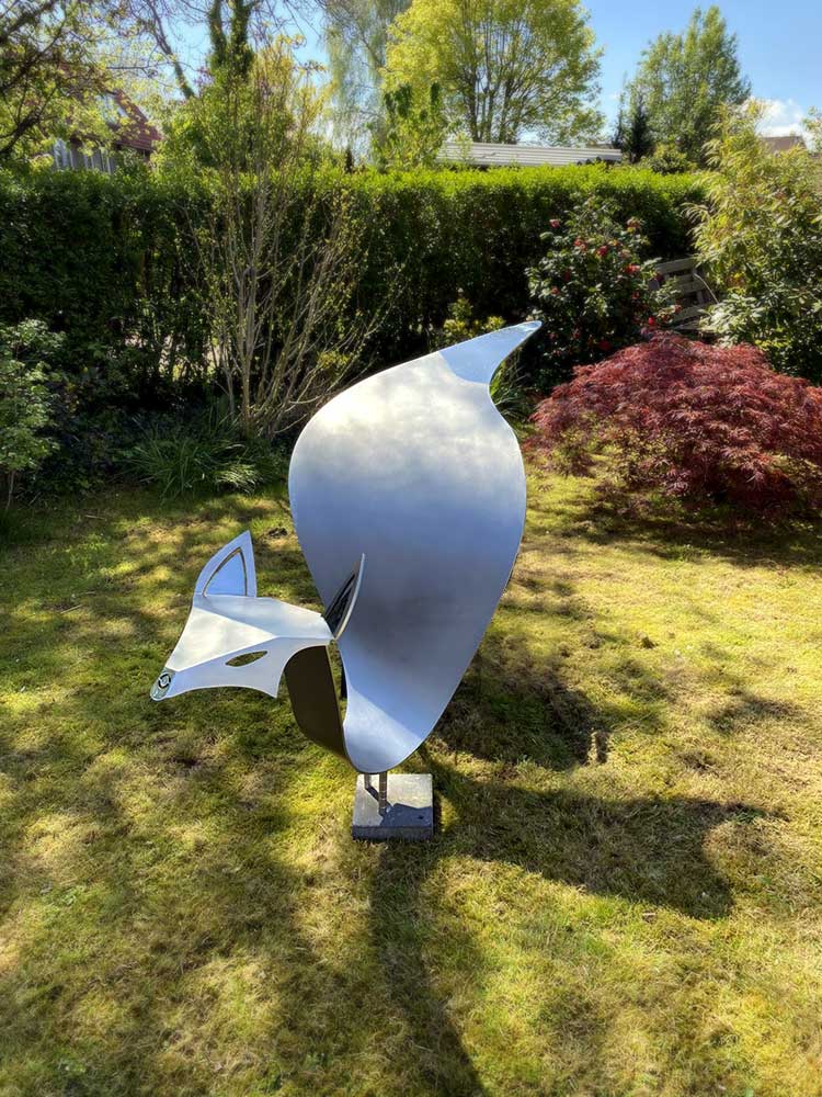 Dit kunstwerk, gemaakt van hoogwaardig inox, past perfect bij de stijl van de tuin en de persoonlijke voorkeur van de opdrachtgevers. Het RVS materiaal zorgt voor een moderne, duurzame uitstraling en reflecteert prachtig het licht, waardoor het beeld op verschillende momenten van de dag een andere uitstraling heeft.
