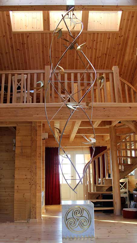 Boven de marmeren kubus hangen 3 in elkaar gedraaide RVS strengen met zwaluwen. De drie strengen verbeelden weer de drie basiskrachten. En de zwaluwen cirkelen lekker ongeordend naar boven; naar het licht van 6 dakramen.